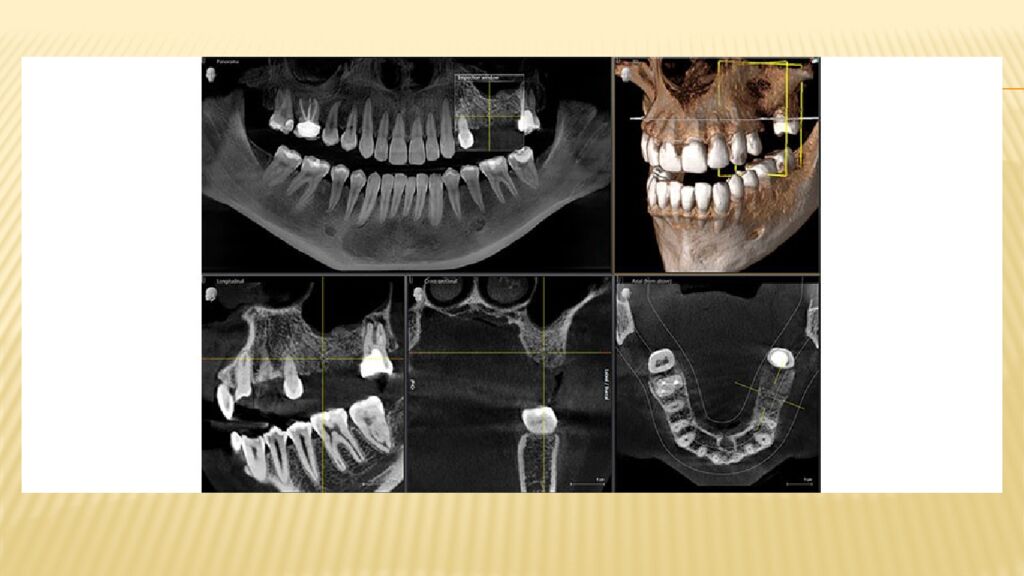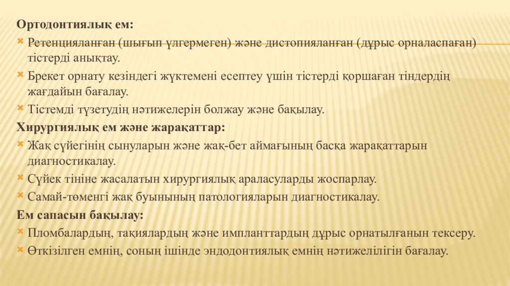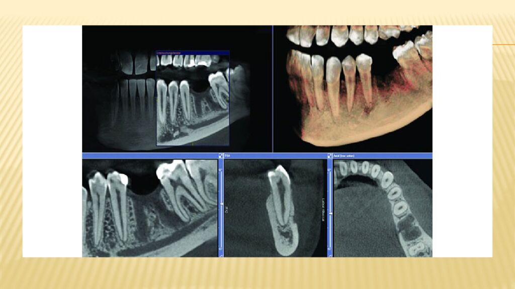 Ортодонтиялық ем: Ретенцияланған ( шығып үлгермеген ) және дистопияланған ( дұрыс орналаспаған ) тістерді анықтау. Брекет орнату кезіндегі жүктемені есептеу үшін тістерді қоршаған тіндердің жағдайын бағалау. Тістемді түзетудің нәтижелерін болжау және бақылау. Хирургиялық ем және жарақаттар : Жақ сүйегінің сынуларын және жақ -бет аймағының басқа жарақаттарын диагностикалау. Сүйек тініне жасалатын хирургиялық араласуларды жоспарлау. Самай-төменгі жақ буынының патологияларын диагностикалау. Ем сапасын бақылау : Пломбалардың, тақиялардың және импланттардың дұрыс орнатылғанын тексеру. Өткізілген емнің, соның ішінде эндодонтиялық емнің нәтижелілігін бағалау.