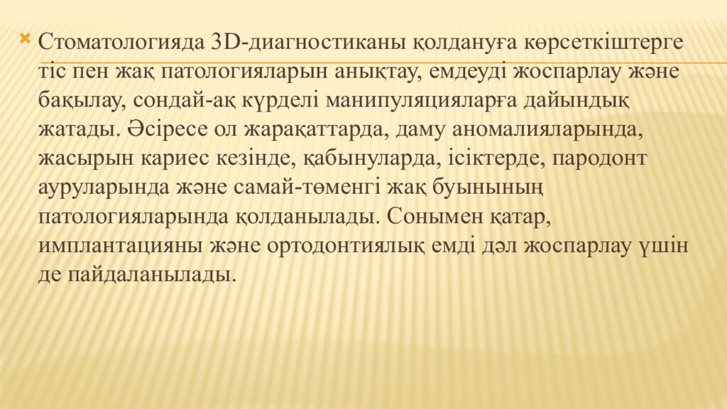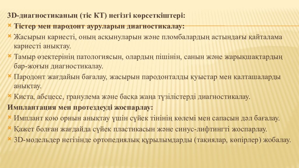 3D- диагностиканың ( тіс КТ) негізгі көрсеткіштері : Тістер мен пародонт ауруларын диагностикалау : Жасырын кариесті, оның асқынуларын және пломбалардың астындағы қайталама кариесті анықтау. Тамыр өзектерінің патологиясын, олардың пішінін, санын және жарықшақтардың бар- жоғын диагностикалау. Пародонт жағдайын бағалау, жасырын пародонталды қуыстар мен қалташаларды анықтау. Киста, абсцесс, гранулема және басқа жаңа түзілістерді диагностикалау. Имплантация мен протездеуді жоспарлау : Имплант қою орнын анықтау үшін сүйек тінінің көлемі мен сапасын дәл бағалау. Қажет болған жағдайда сүйек пластикасын және синус- лифтингті жоспарлау. 3 D- модельдер негізінде ортопедиялық құрылымдарды ( тақиялар, көпірлер ) жобалау.