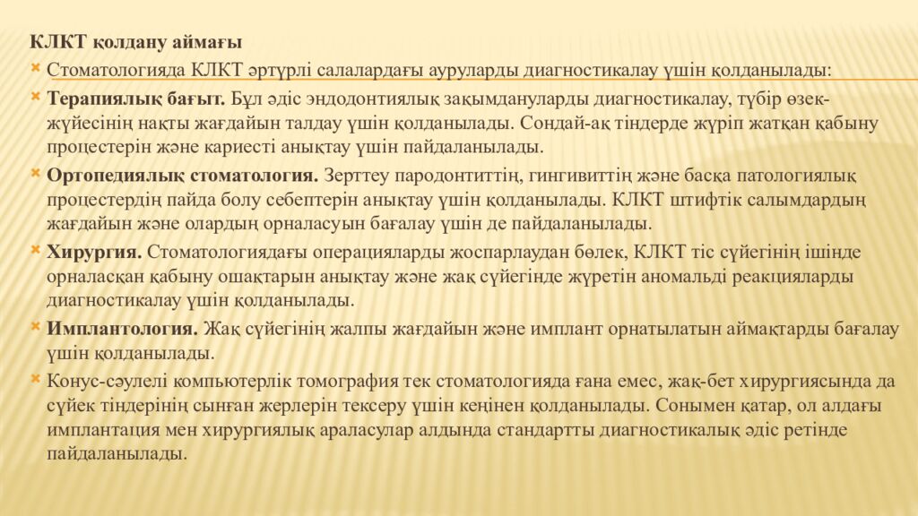 КЛКТ қолдану аймағы Стоматологияда КЛКТ әртүрлі салалардағы ауруларды диагностикалау үшін қолданылады : Терапиялық бағыт. Бұл әдіс эндодонтиялық зақымдануларды диагностикалау, түбір өзек-жүйесінің нақты жағдайын талдау үшін қолданылады. Сондай-ақ тіндерде жүріп жатқан қабыну процестерін және кариесті анықтау үшін пайдаланылады. Ортопедиялық стоматология. Зерттеу пародонтиттің, гингивиттің және басқа патологиялық процестердің пайда болу себептерін анықтау үшін қолданылады. КЛКТ штифтік салымдардың жағдайын және олардың орналасуын бағалау үшін де пайдаланылады. Хирургия. Стоматологиядағы операцияларды жоспарлаудан бөлек, КЛКТ тіс сүйегінің ішінде орналасқан қабыну ошақтарын анықтау және жақ сүйегінде жүретін аномальді реакцияларды диагностикалау үшін қолданылады. Имплантология. Жақ сүйегінің жалпы жағдайын және имплант орнатылатын аймақтарды бағалау үшін қолданылады. Конус- сәулелі компьютерлік томография тек стоматологияда ғана емес, жақ -бет хирургиясында да сүйек тіндерінің сынған жерлерін тексеру үшін кеңінен қолданылады. Сонымен қатар, ол алдағы имплантация мен хирургиялық араласулар алдында стандартты диагностикалық әдіс ретінде пайдаланылады.