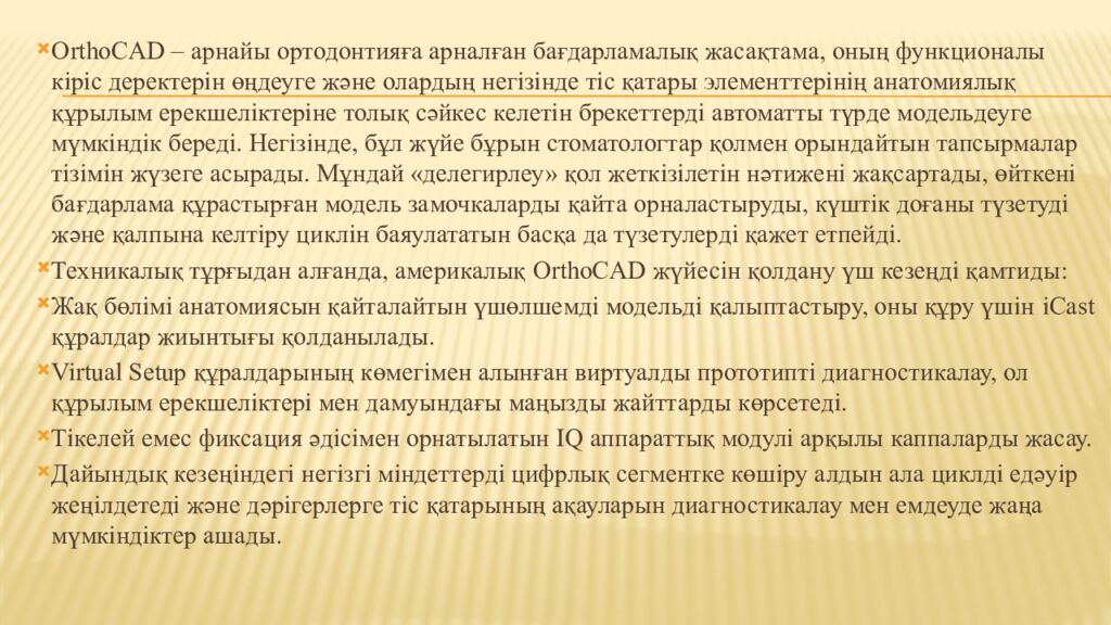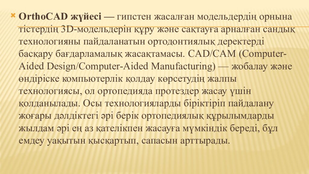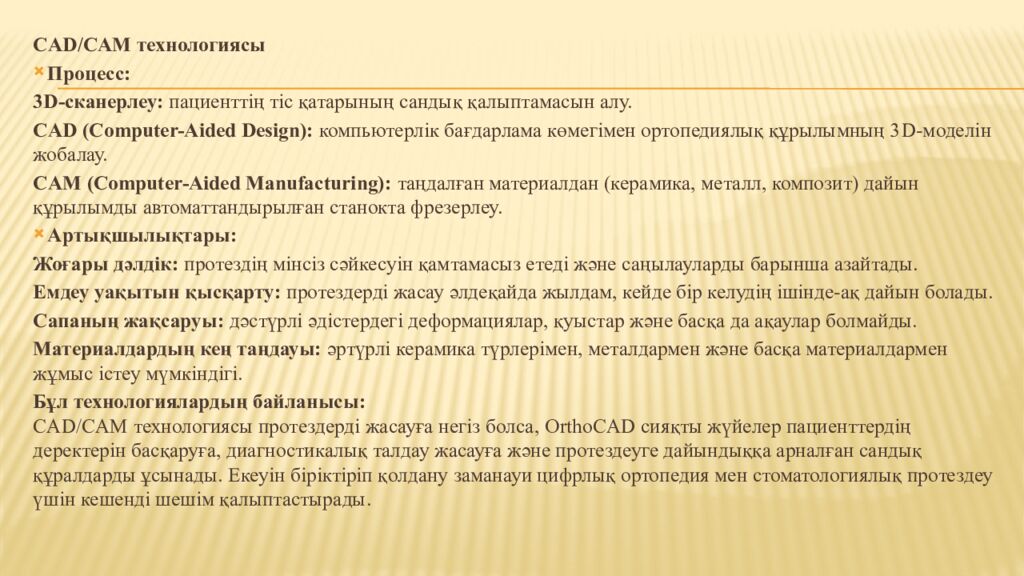 CAD/CAM технологиясы Процесс: 3 D- сканерлеу : пациенттің тіс қатарының сандық қалыптамасын алу. CAD (Computer-Aided Design): компьютерлік бағдарлама көмегімен ортопедиялық құрылымның 3 D- моделін жобалау. CAM (Computer-Aided Manufacturing): таңдалған материалдан (керамика, металл, композит) дайын құрылымды автоматтандырылған станокта фрезерлеу. Артықшылықтары : Жоғары дәлдік : протездің мінсіз сәйкесуін қамтамасыз етеді және саңылауларды барынша азайтады. Емдеу уақытын қысқарту : протездерді жасау әлдеқайда жылдам, кейде бір келудің ішінде-ақ дайын болады. Сапаның жақсаруы : дәстүрлі әдістердегі деформациялар, қуыстар және басқа да ақаулар болмайды. Материалдардың кең таңдауы : әртүрлі керамика түрлерімен, металдармен және басқа материалдармен жұмыс істеу мүмкіндігі. Бұл технологиялардың байланысы : CAD/CAM технологиясы протездерді жасауға негіз болса, OrthoCAD сияқты жүйелер пациенттердің деректерін басқаруға, диагностикалық талдау жасауға және протездеуге дайындыққа арналған сандық құралдарды ұсынады. Екеуін біріктіріп қолдану заманауи цифрлық ортопедия мен стоматологиялық протездеу үшін кешенді шешім қалыптастырады.
