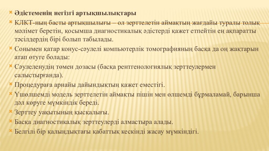 Әдістеменің негізгі артықшылықтары КЛКТ- ның басты артықшылығы – ол зерттелетін аймақтың жағдайы туралы толық мәлімет беретін, қосымша диагностикалық әдістерді қажет етпейтін ең ақпаратты тәсілдердің бірі болып табылады. Сонымен қатар конус- сәулелі компьютерлік томографияның басқа да оң жақтарын атап өтуге болады : Сәулеленудің төмен дозасы ( басқа рентгенологиялық зерттеулермен салыстырғанда ). Процедураға арнайы дайындықтың қажет еместігі. Үшөлшемді модель зерттелетін аймақты пішін мен өлшемді бұрмаламай, барынша дәл көруге мүмкіндік береді. Зерттеу уақытының қысқалығы. Басқа диагностикалық зерттеулерді алмастыра алады. Белгілі бір қалыңдықтағы қабаттық кескінді жасау мүмкіндігі.