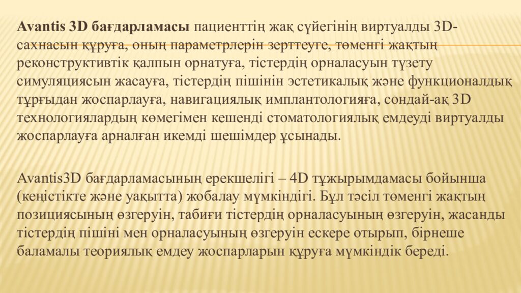Avantis 3D бағдарламасы пациенттің жақ сүйегінің виртуалды 3 D- сахнасын құруға, оның параметрлерін зерттеуге, төменгі жақтың реконструктивтік қалпын орнатуға, тістердің орналасуын түзету симуляциясын жасауға, тістердің пішінін эстетикалық және функционалдық тұрғыдан жоспарлауға, навигациялық имплантологияға, сондай-ақ 3 D технологиялардың көмегімен кешенді стоматологиялық емдеуді виртуалды жоспарлауға арналған икемді шешімдер ұсынады. Avantis3D бағдарламасының ерекшелігі – 4 D тұжырымдамасы бойынша ( кеңістікте және уақытта ) жобалау мүмкіндігі. Бұл тәсіл төменгі жақтың позициясының өзгеруін, табиғи тістердің орналасуының өзгеруін, жасанды тістердің пішіні мен орналасуының өзгеруін ескере отырып, бірнеше баламалы теориялық емдеу жоспарларын құруға мүмкіндік береді.