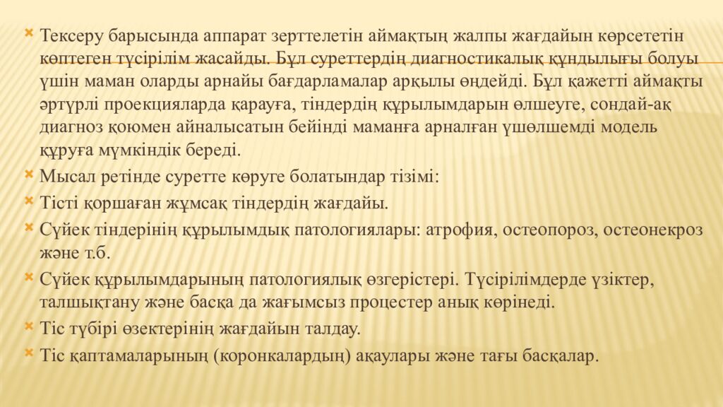 Тексеру барысында аппарат зерттелетін аймақтың жалпы жағдайын көрсететін көптеген түсірілім жасайды. Бұл суреттердің диагностикалық құндылығы болуы үшін маман оларды арнайы бағдарламалар арқылы өңдейді. Бұл қажетті аймақты әртүрлі проекцияларда қарауға, тіндердің құрылымдарын өлшеуге, сондай-ақ диагноз қоюмен айналысатын бейінді маманға арналған үшөлшемді модель құруға мүмкіндік береді. Мысал ретінде суретте көруге болатындар тізімі : Тісті қоршаған жұмсақ тіндердің жағдайы. Сүйек тіндерінің құрылымдық патологиялары : атрофия, остеопороз, остеонекроз және т.б. Сүйек құрылымдарының патологиялық өзгерістері. Түсірілімдерде үзіктер, талшықтану және басқа да жағымсыз процестер анық көрінеді. Тіс түбірі өзектерінің жағдайын талдау. Тіс қаптамаларының ( коронкалардың ) ақаулары және тағы басқалар.