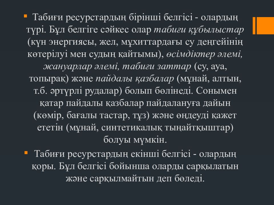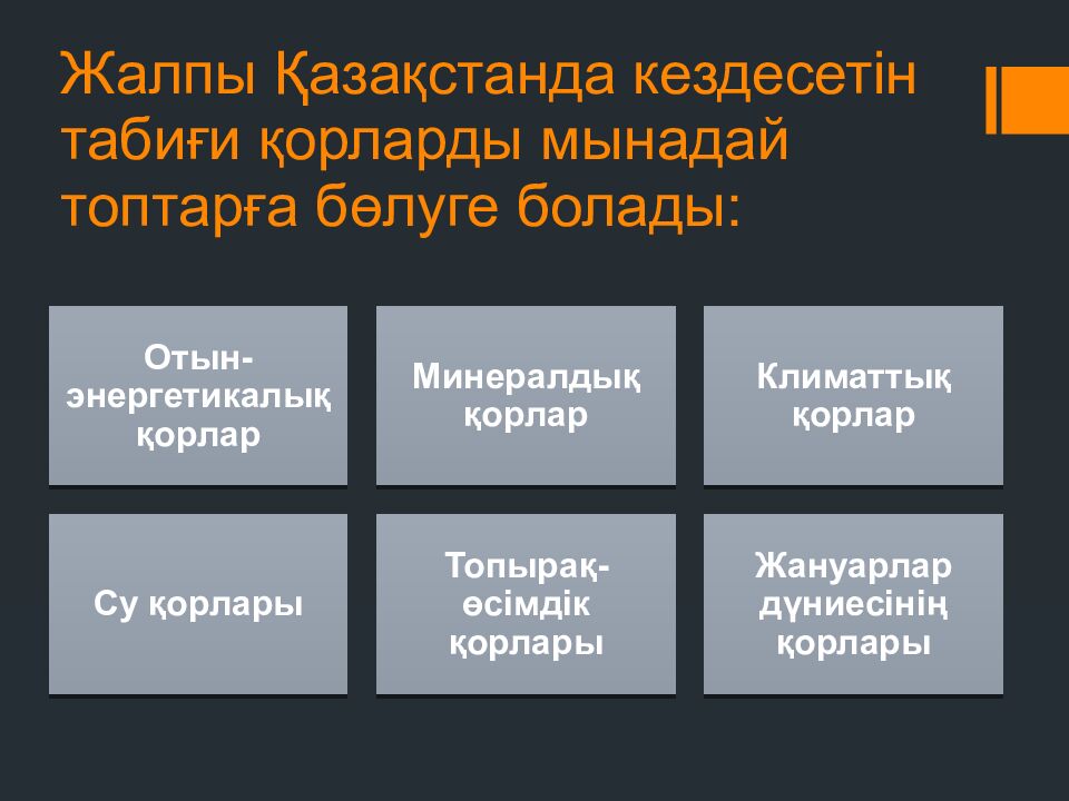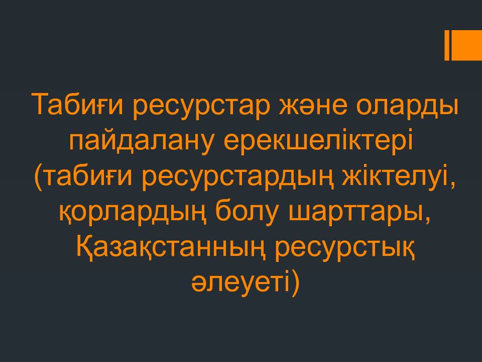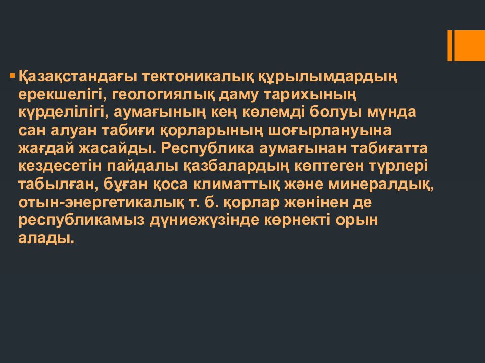 Қазақстандағы тектоникалық құрылымдардың ерекшелігі, геологиялық даму тарихының күрделілігі, аумағының кең көлемді болуы мүнда сан алуан табиғи қорларының шоғырлануына жағдай жасайды. Республика аумағынан табиғатта кездесетін пайдалы қазбалардың көптеген түрлері табылған, бұған қоса климаттық және минералдық, отын-энергетикалық т. б. қорлар жөнінен де республикамыз дүниежүзінде көрнекті орын алады.