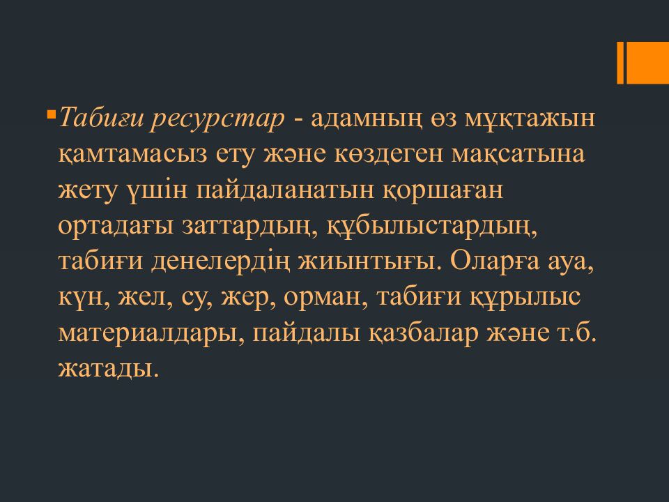 Табиғи ресурстар - адамның өз мұқтажын қамтамасыз ету және көздеген мақсатына жету үшін пайдаланатын қоршаған ортадағы заттардың, құбылыстардың, табиғи денелердің жиынтығы. Оларға ауа, күн, жел, су, жер, орман, табиғи құрылыс материалдары, пайдалы қазбалар және т.б. жатады.