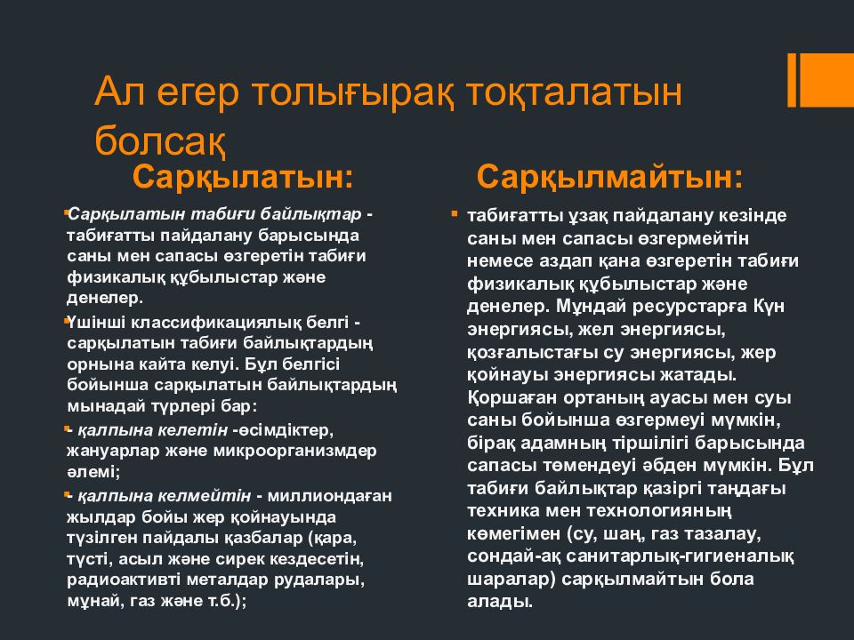 Сарқылатын : Сарқылмайтын : Ал егер толығырақ тоқталатын болсақ Сарқылатын табиғи байлықтар - табиғатты пайдалану барысында саны мен сапасы өзгеретін табиғи физикалық құбылыстар және денелер. Үшінші классификациялық белгі - сарқылатын табиғи байлықтардың орнына кайта келуі. Бұл белгісі бойынша сарқылатын байлықтардың мынадай түрлері бар: - қалпына келетін - өсімдіктер, жануарлар және микроорганизмдер әлемі ; - қалпына келмейтін - миллиондаған жылдар бойы жер қойнауында түзілген пайдалы қазбалар ( қара, түсті, асыл және сирек кездесетін, радиоактивті металдар рудалары, мұнай, газ және т.б.); табиғатты ұзақ пайдалану кезінде саны мен сапасы өзгермейтін немесе аздап қана өзгеретін табиғи физикалық құбылыстар және денелер. Мұндай ресурстарға Күн энергиясы, жел энергиясы, қозғалыстағы су энергиясы, жер қойнауы энергиясы жатады. Қоршаған ортаның ауасы мен суы саны бойынша өзгермеуі мүмкін, бірақ адамның тіршілігі барысында сапасы төмендеуі әбден мүмкін. Бұл табиғи байлықтар қазіргі таңдағы техника мен технологияның көмегімен (су, шаң, газ тазалау, сондай-ақ санитарлық-гигиеналық шаралар ) сарқылмайтын бола алады.