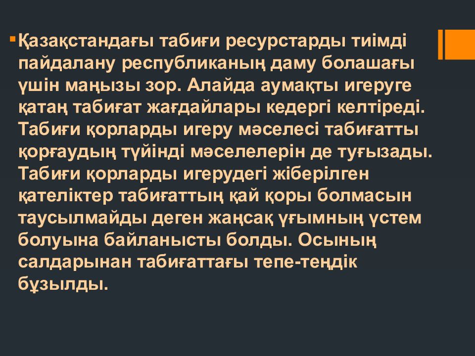 Қазақстандағы табиғи ресурстарды тиімді пайдалану республиканың даму болашағы үшін маңызы зор. Алайда аумақты игеруге қатаң табиғат жағдайлары кедергі келтіреді. Табиғи қорларды игеру мәселесі табиғатты қорғаудың түйінді мәселелерін де туғызады. Табиғи қорларды игерудегі жіберілген қателіктер табиғаттың қай қоры болмасын таусылмайды деген жаңсақ үғымның үстем болуына байланысты болды. Осының салдарынан табиғаттағы тепе- теңдік бұзылды.