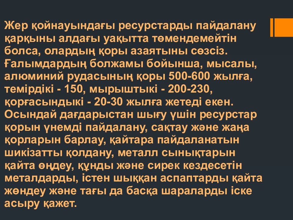 Жер қойнауындағы ресурстарды пайдалану қарқыны алдағы уақытта төмендемейтін болса, олардың қоры азаятыны сөзсіз. Ғалымдардың болжамы бойынша, мысалы, алюминий рудасының қоры 500-600 жылға, темірдікі - 150, мырыштыкі - 200-230, қорғасындыкі - 20-30 жылға жетеді екен. Осындай дағдарыстан шығу үшін ресурстар қорын үнемді пайдалану, сақтау және жаңа қорларын барлау, қайтара пайдаланатын шикізатты қолдану, металл сынықтарын қайта өңдеу, құнды және сирек кездесетін металдарды, істен шыққан аспаптарды қайта жөндеу және тағы да басқа шараларды іске асыру қажет.