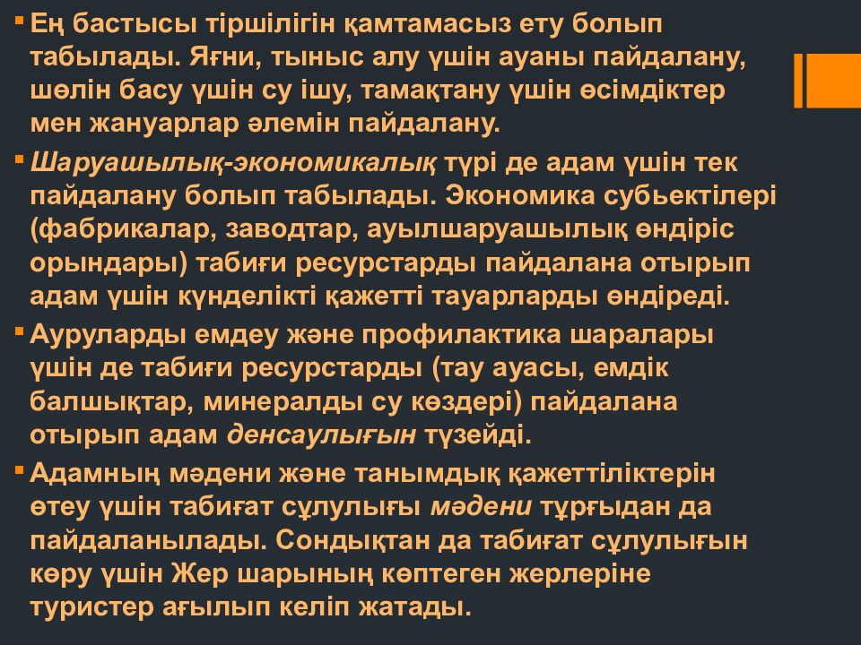 Ең бастысы тіршілігін қамтамасыз ету болып табылады. Яғни, тыныс алу үшін ауаны пайдалану, шөлін басу үшін су ішу, тамақтану үшін өсімдіктер мен жануарлар әлемін пайдалану. Шаруашылық-экономикалық түрі де адам үшін тек пайдалану болып табылады. Экономика субьектілері ( фабрикалар, заводтар, ауылшаруашылық өндіріс орындары ) табиғи ресурстарды пайдалана отырып адам үшін күнделікті қажетті тауарларды өндіреді. Ауруларды емдеу және профилактика шаралары үшін де табиғи ресурстарды (тау ауасы, емдік балшықтар, минералды су көздері ) пайдалана отырып адам денсаулығын түзейді. Адамның мәдени және танымдық қажеттіліктерін өтеу үшін табиғат сұлулығы мәдени тұрғыдан да пайдаланылады. Сондықтан да табиғат сұлулығын көру үшін Жер шарының көптеген жерлеріне туристер ағылып келіп жатады.