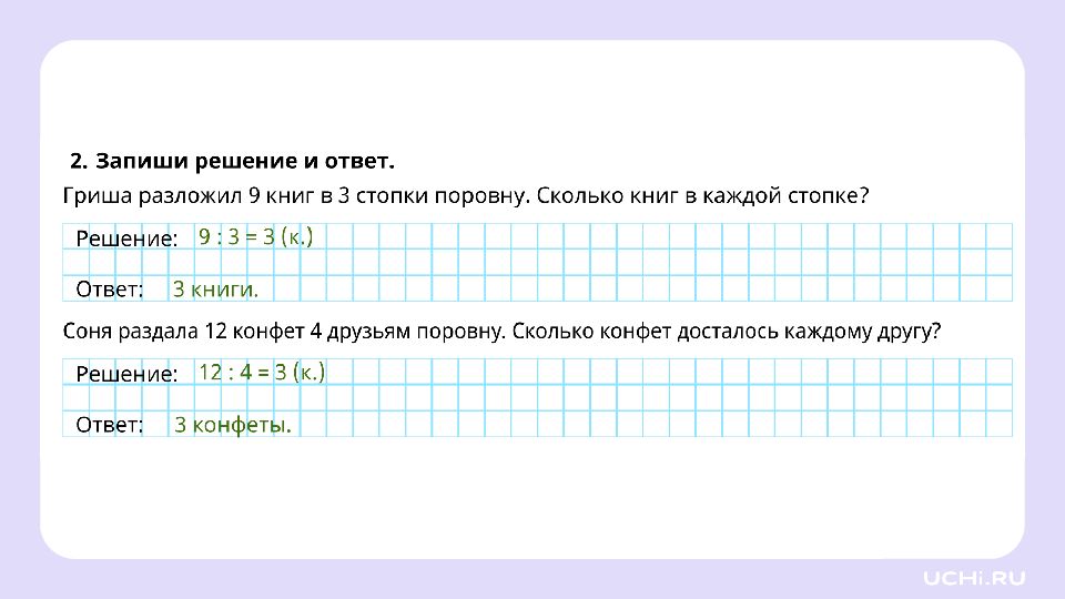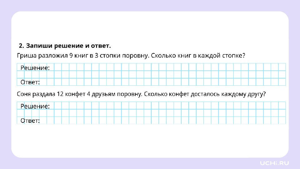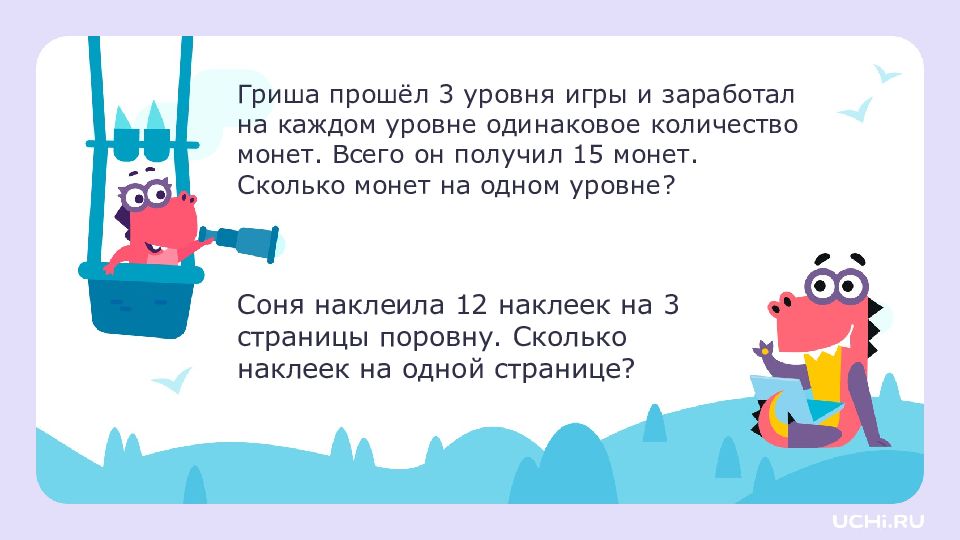 Гриша прошёл 3 уровня игры и заработал на каждом уровне одинаковое количество монет. Всего он получил 15 монет. Сколько монет на одном уровне? Соня наклеила 12 наклеек на 3 страницы поровну. Сколько наклеек на одной странице?
