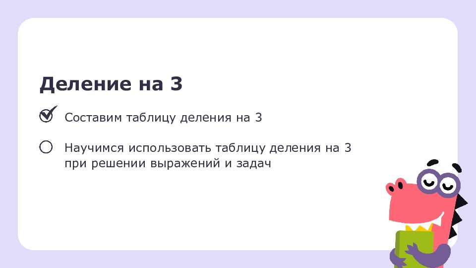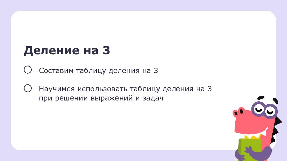 Деление на 3 Составим таблицу деления на 3 Научимся использовать таблицу деления на 3 при решении выражений и задач