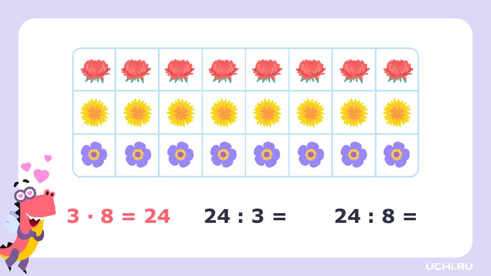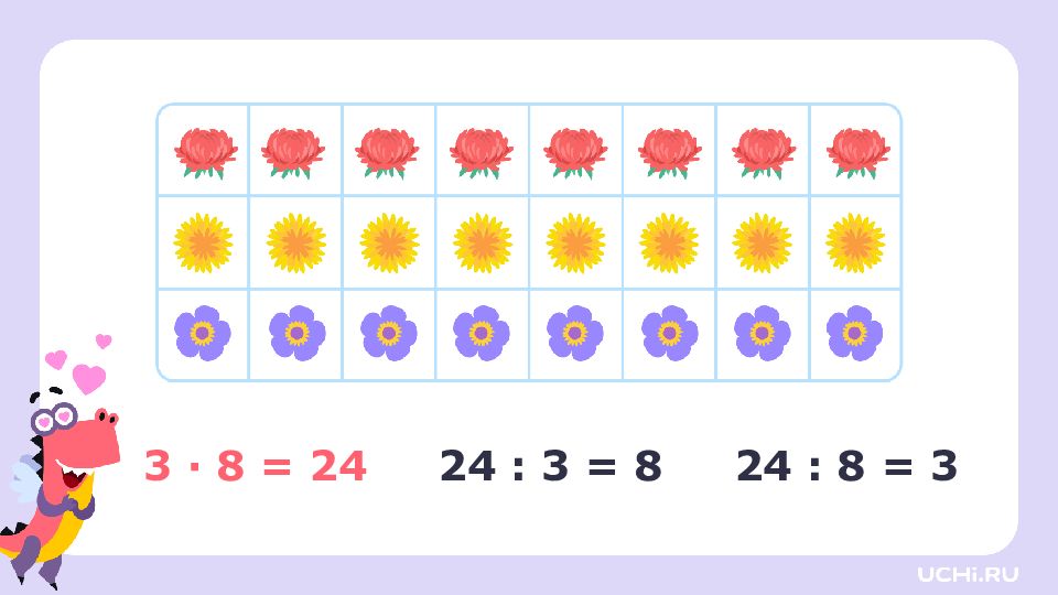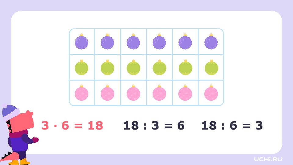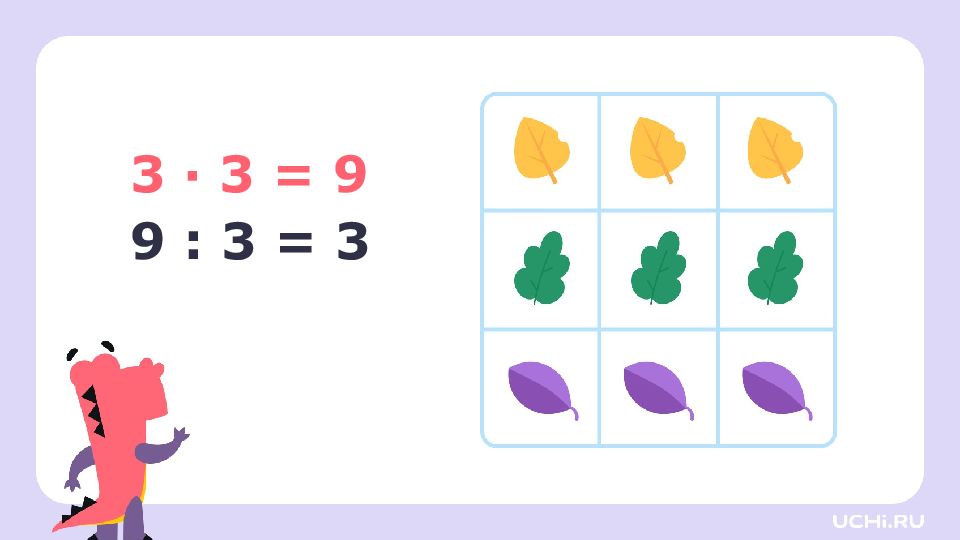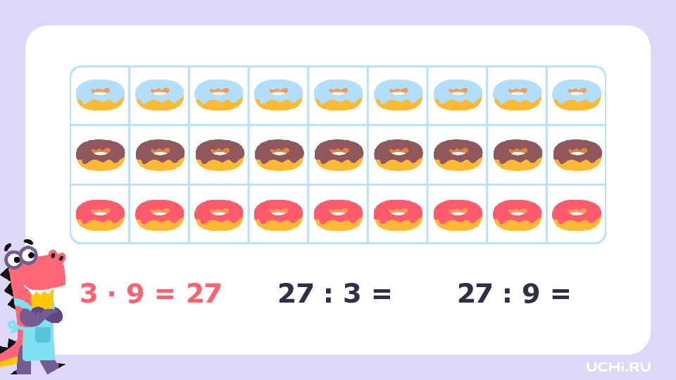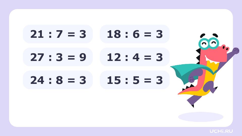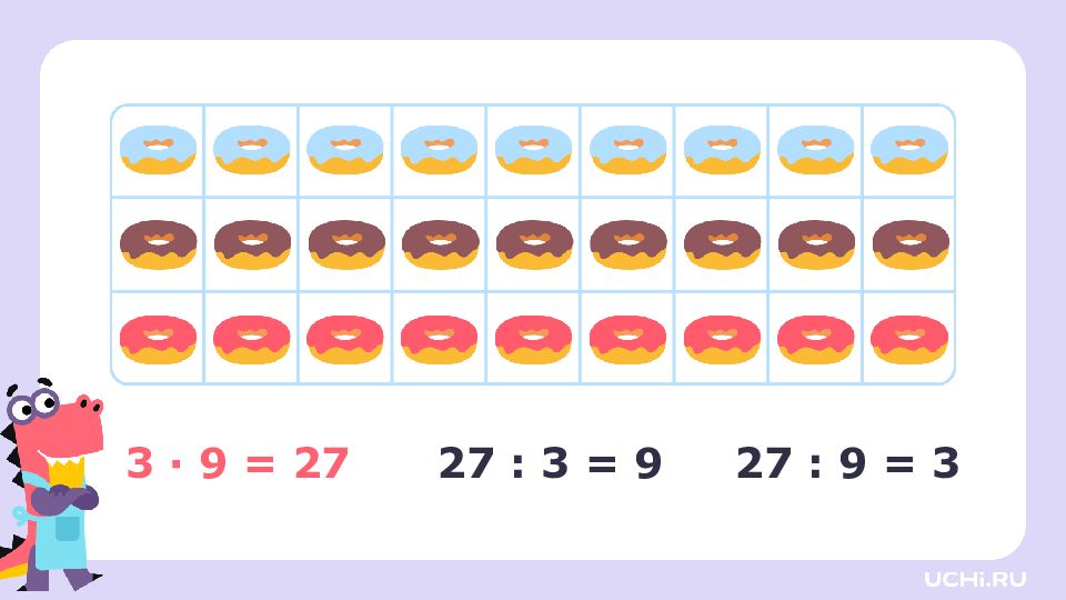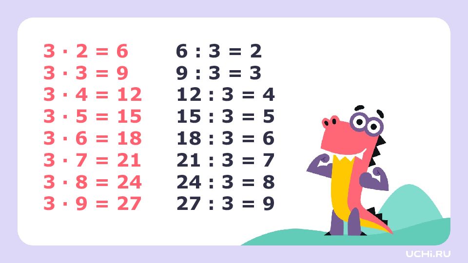 3 · 2 = 6 3 · 3 = 9 3 · 4 = 12 3 · 5 = 15 3 · 6 = 18 3 · 7 = 21 3 · 8 = 24 3 · 9 = 27 6 : 3 = 2 9 : 3 = 3 12 : 3 = 4 15 : 3 = 5 18 : 3 = 6 21 : 3 = 7 24 : 3 = 8 27 : 3 = 9