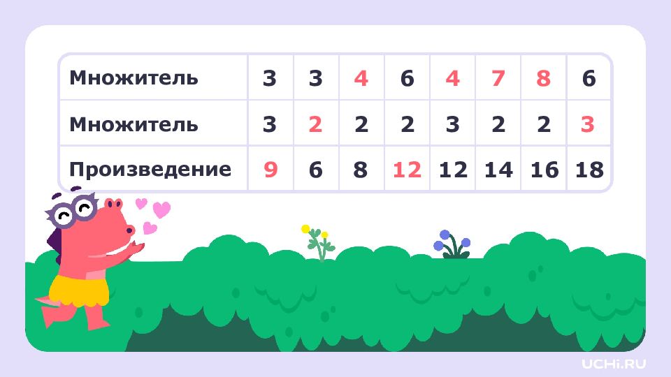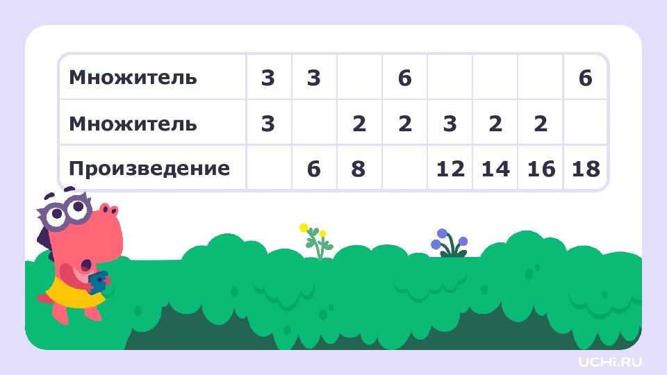 Множитель Множитель Произведение 3 3 6 6 3 2 2 3 2 2 6 8 12 14 16 18 4 4 7 8 2 3 9 12