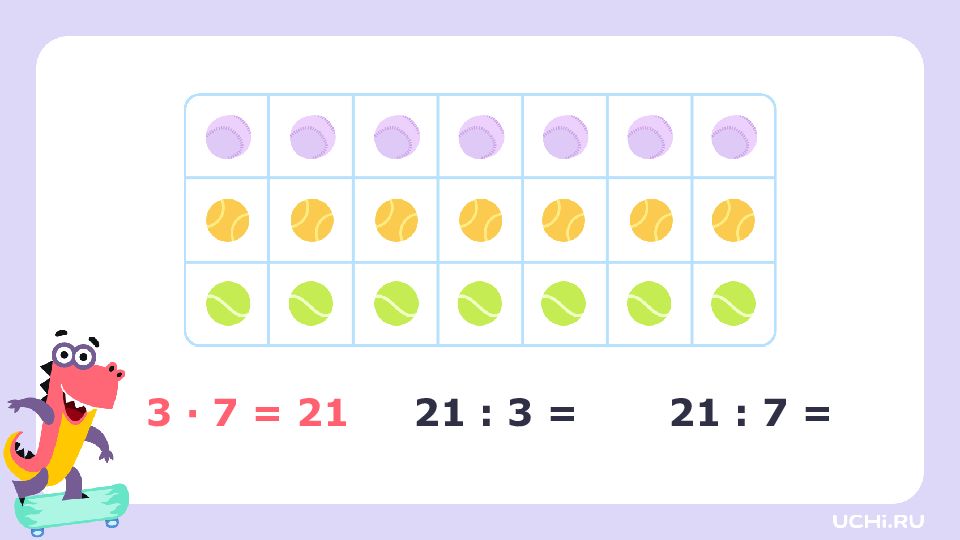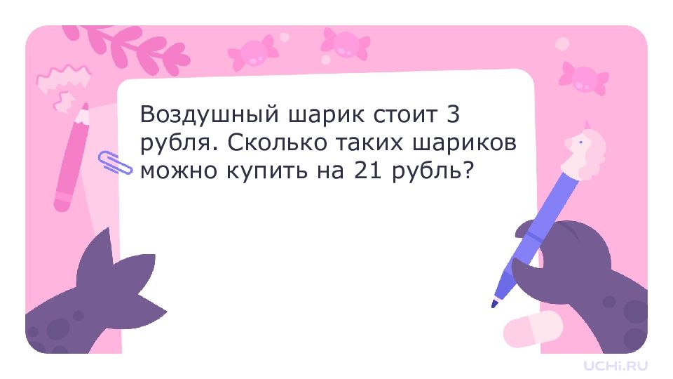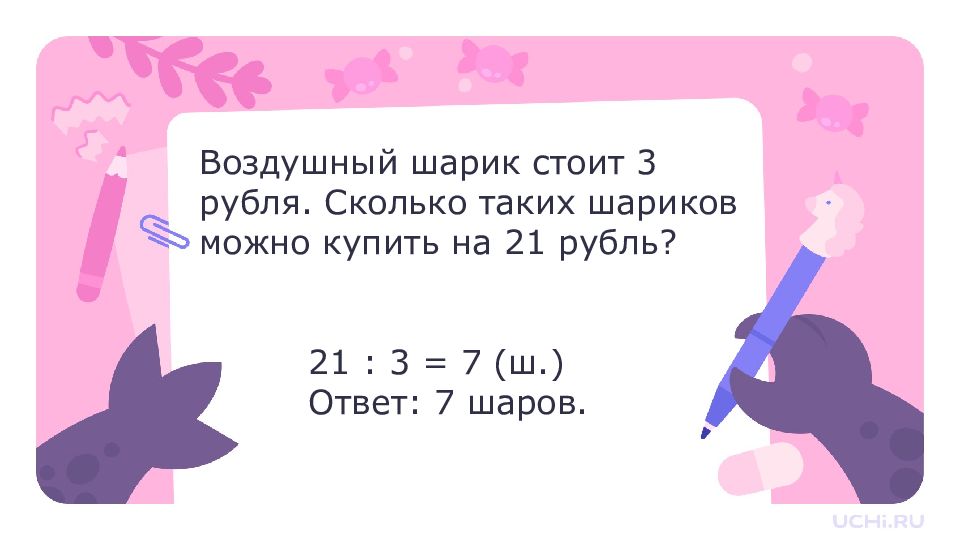 21 : 3 = 7 (ш.) Ответ: 7 шаров. Воздушный шарик стоит 3 рубля. Сколько таких шариков можно купить на 21 рубль?