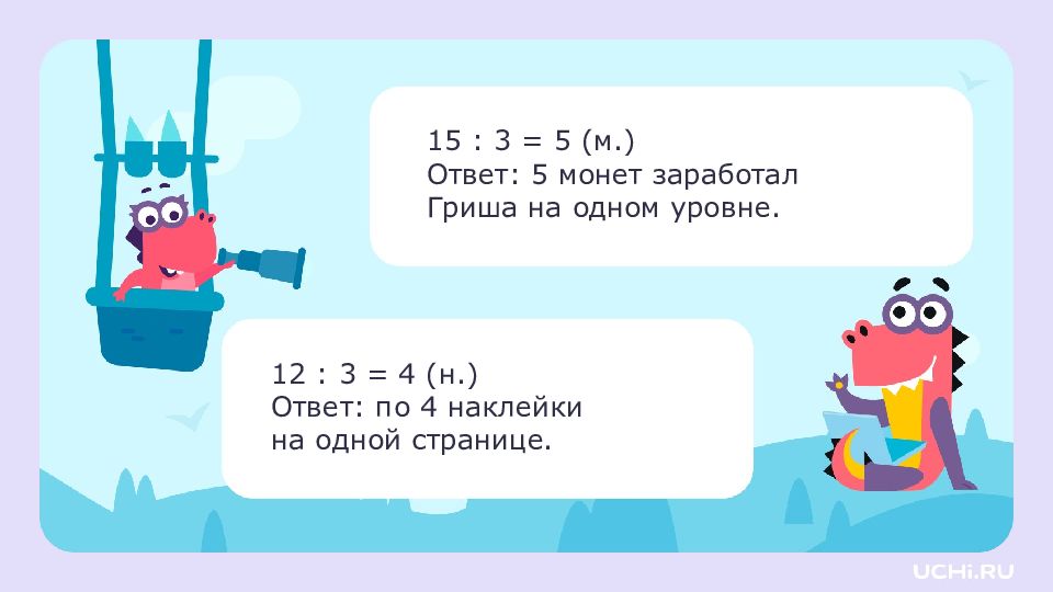 15 : 3 = 5 (м.) Ответ: 5 монет заработал Гриша на одном уровне. 12 : 3 = 4 (н.) Ответ: по 4 наклейки на одной странице.
