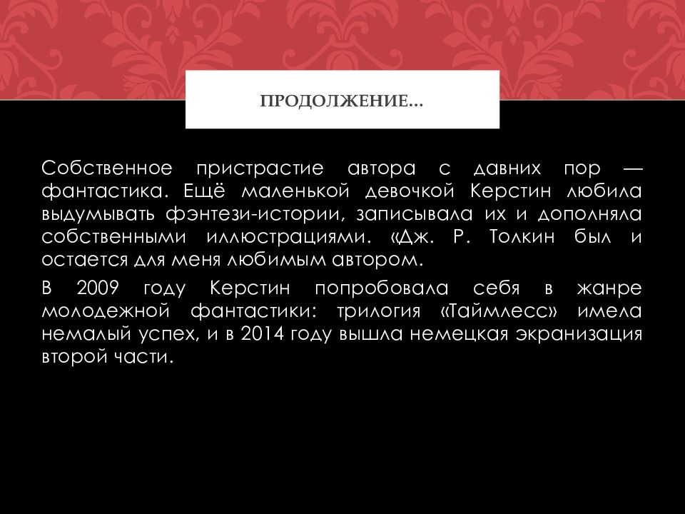Собственное пристрастие автора с давних пор — фантастика. Ещё маленькой девочкой Керстин любила выдумывать фэнтези -истории, записывала их и дополняла собственными иллюстрациями. « Дж. Р. Толкин был и остается для меня любимым автором. В 2009 году Керстин попробовала себя в жанре молодежной фантастики: трилогия « Таймлесс » имела немалый успех, и в 2014 году вышла немецкая экранизация второй части. Продолжение…