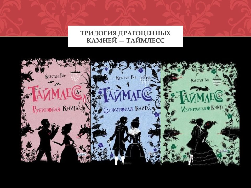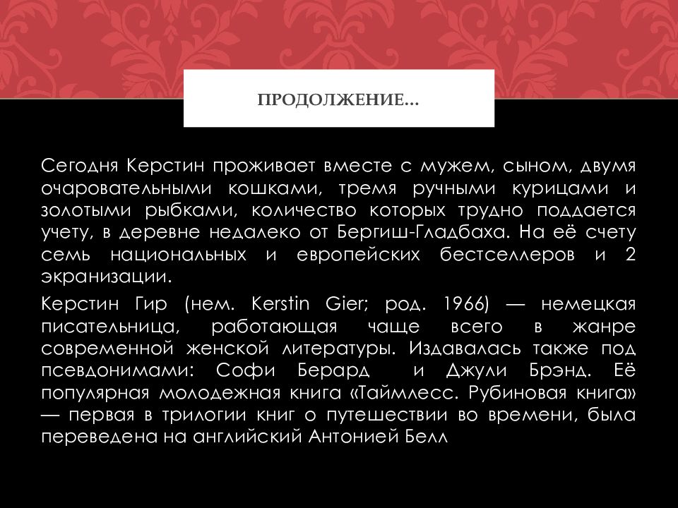 Сегодня Керстин проживает вместе с мужем, сыном, двумя очаровательными кошками, тремя ручными курицами и золотыми рыбками, количество которых трудно поддается учету, в деревне недалеко от Бергиш-Гладбаха. На её счету семь национальных и европейских бестселлеров и 2 экранизации. Керстин Гир (нем. Kerstin Gier ; род. 1966) — немецкая писательница, работающая чаще всего в жанре современной женской литературы. Издавалась также под псевдонимами: Софи Берард и Джули Брэнд. Её популярная молодежная книга « Таймлесс. Рубиновая книга » — первая в трилогии книг о путешествии во времени, была переведена на английский Антонией Белл Продолжение…