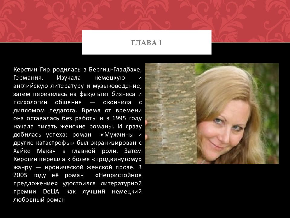 Керстин Гир родилась в Бергиш-Гладбахе, Германия. Изучала немецкую и английскую литературу и музыковедение, затем перевелась на факультет бизнеса и психологии общения — окончила с дипломом педагога. Время от времени она оставалась без работы и в 1995 году начала писать женские романы. И сразу добилась успеха: роман « Мужчины и другие катастрофы » был экранизирован с Хайке Макач в главной роли. Затем Керстин перешла к более « продвинутому » жанру — иронической женской прозе. В 2005 году её роман « Непристойное предложение » удостоился литературной премии DeLiA как лучший немецкий любовный роман ГЛАВА 1