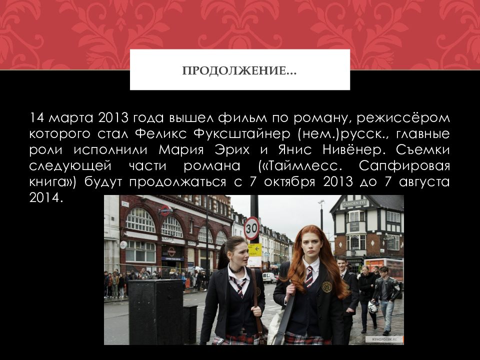 14 марта 2013 года вышел фильм по роману, режиссёром которого стал Феликс Фуксштайнер (нем.)русск., главные роли исполнили Мария Эрих и Янис Нивёнер. Съемки следующей части романа ( « Таймлесс. Сапфировая книга ») будут продолжаться с 7 октября 2013 до 7 августа 2014. Продолжение…
