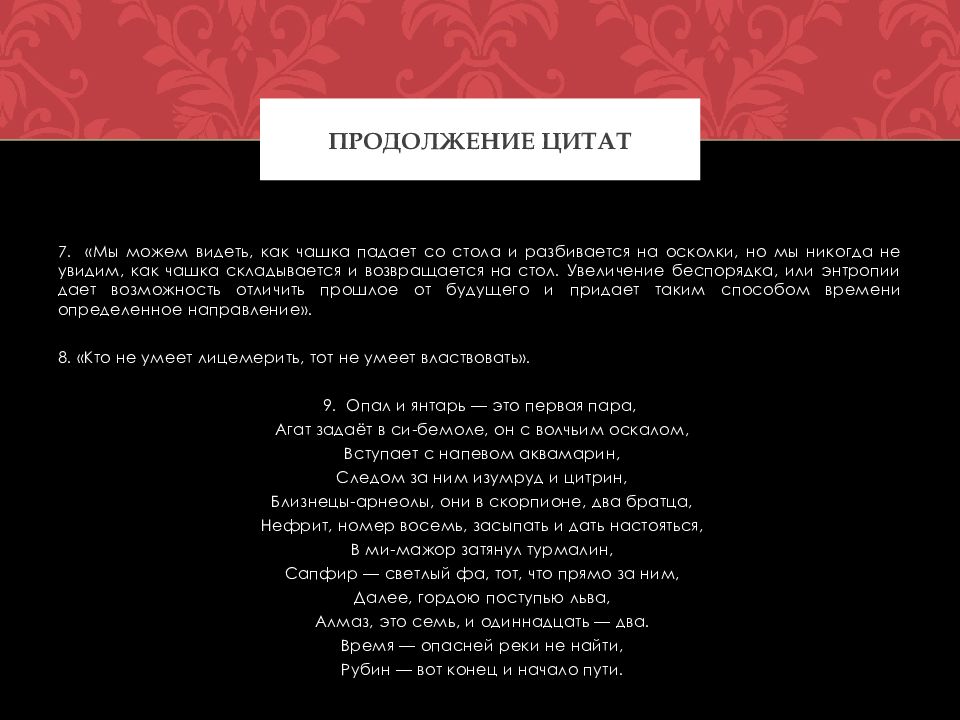 7. «Мы можем видеть, как чашка падает со стола и разбивается на осколки, но мы никогда не увидим, как чашка складывается и возвращается на стол. Увеличение беспорядка, или энтропии дает возможность отличить прошлое от будущего и придает таким способом времени определенное направление». 8. «Кто не умеет лицемерить, тот не умеет властвовать». 9. Опал и янтарь — это первая пара, Агат задаёт в си-бемоле, он с волчьим оскалом, Вступает с напевом аквамарин, Следом за ним изумруд и цитрин, Близнецы- арнеолы, они в скорпионе, два братца, Нефрит, номер восемь, засыпать и дать настояться, В ми-мажор затянул турмалин, Сапфир — светлый фа, тот, что прямо за ним, Далее, гордою поступью льва, Алмаз, это семь, и одиннадцать — два. Время — опасней реки не найти, Рубин — вот конец и начало пути. Продолжение цитат