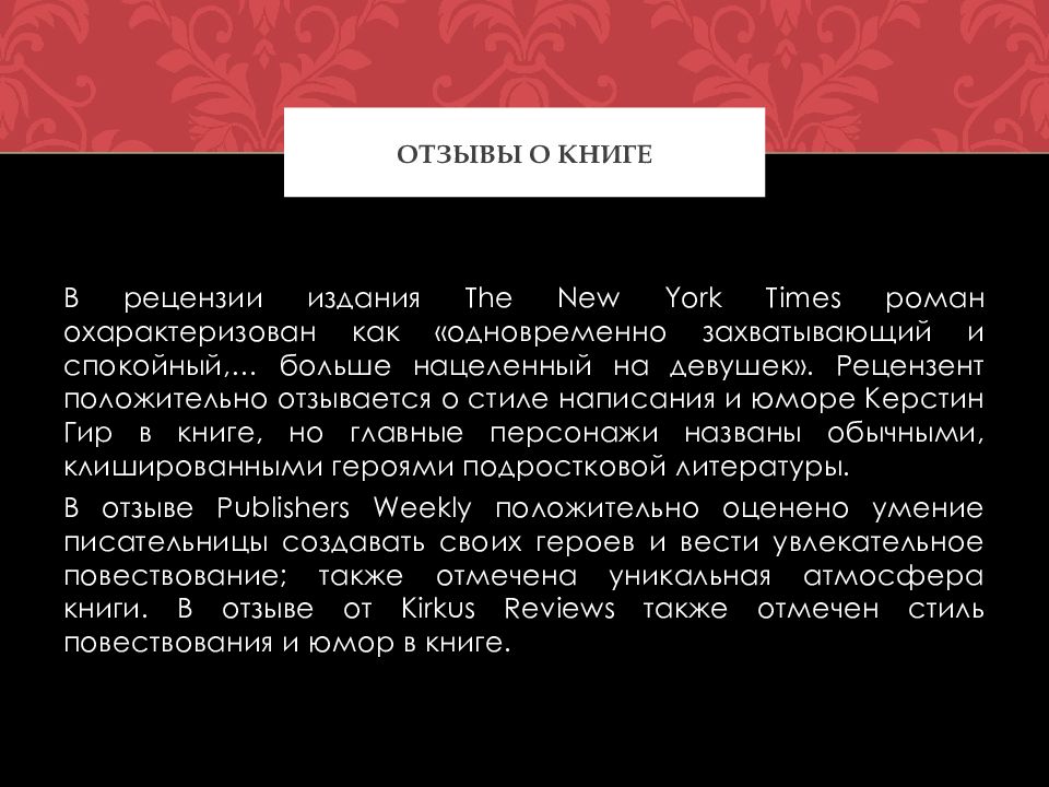 В рецензии издания The New York Times роман охарактеризован как « одновременно захватывающий и спокойный,… больше нацеленный на девушек ». Рецензент положительно отзывается о стиле написания и юморе Керстин Гир в книге, но главные персонажи названы обычными, клишированными героями подростковой литературы. В отзыве Publishers Weekly положительно оценено умение писательницы создавать своих героев и вести увлекательное повествование; также отмечена уникальная атмосфера книги. В отзыве от Kirkus Reviews также отмечен стиль повествования и юмор в книге. Отзывы о книге
