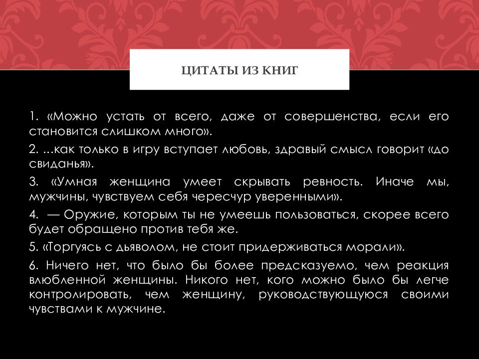 1. «Можно устать от всего, даже от совершенства, если его становится слишком много». 2.... как только в игру вступает любовь, здравый смысл говорит « до свиданья ». 3. «Умная женщина умеет скрывать ревность. Иначе мы, мужчины, чувствуем себя чересчур уверенными». 4. — Оружие, которым ты не умеешь пользоваться, скорее всего будет обращено против тебя же. 5. «Торгуясь с дьяволом, не стоит придерживаться морали». 6. Ничего нет, что было бы более предсказуемо, чем реакция влюбленной женщины. Никого нет, кого можно было бы легче контролировать, чем женщину, руководствующуюся своими чувствами к мужчине. Цитаты из книг