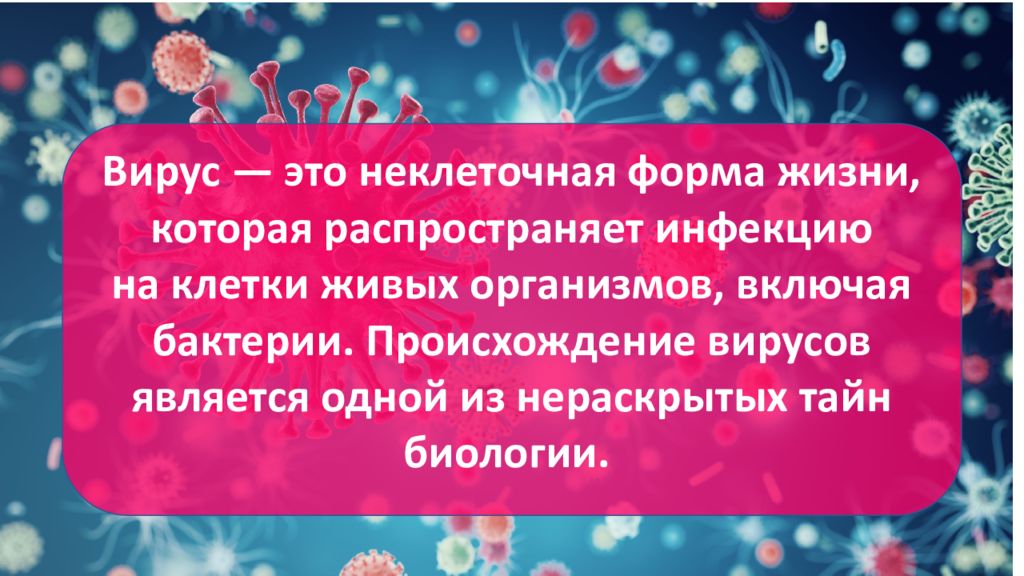 Вирус — это неклеточная форма жизни, которая распространяет инфекцию на клетки живых организмов, включая бактерии. Происхождение вирусов является одной из нераскрытых тайн биологии.