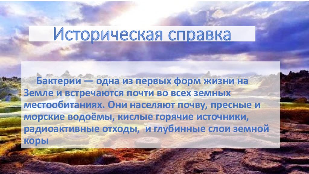 Бактерии — одна из первых форм жизни на Земле и встречаются почти во всех земных местообитаниях. Они населяют почву, пресные и морские водоёмы, кислые горячие источники, радиоактивные отходы, и глубинные слои земной коры