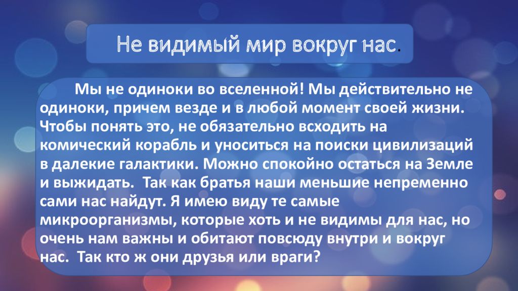 Мы не одиноки во вселенной! Мы действительно не одиноки, причем везде и в любой момент своей жизни. Чтобы понять это, не обязательно всходить на комический корабль и уноситься на поиски цивилизаций в далекие галактики. Можно спокойно остаться на Земле и выжидать. Так как братья наши меньшие непременно сами нас найдут. Я имею виду те самые микроорганизмы, которые хоть и не видимы для нас, но очень нам важны и обитают повсюду внутри и вокруг нас. Так кто ж они друзья или враги?