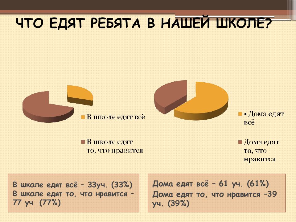 В школе едят всё – 33уч. (33%) В школе едят то, что нравится – 77 уч (77%) Дома едят всё – 61 уч. (61%) Дома едят то, что нравится –39 уч. (39 %) ЧТО ЕДЯТ РЕБЯТА В НАШЕЙ ШКОЛЕ?