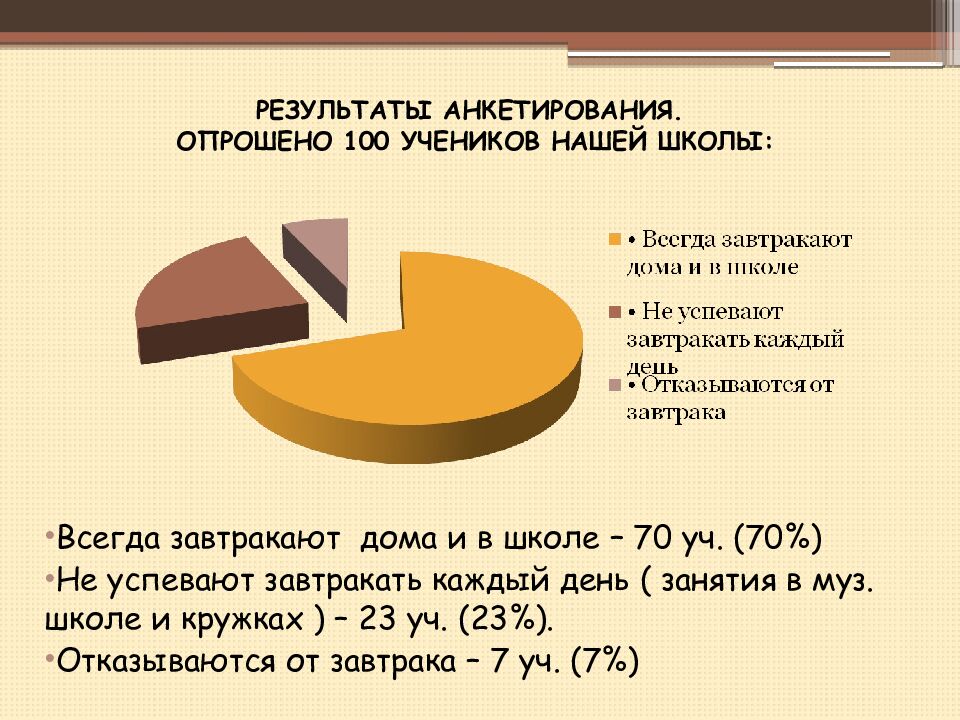 Всегда завтракают дома и в школе – 70 уч. (70%) Не успевают завтракать каждый день ( занятия в муз. школе и кружках ) – 23 уч. (23%). Отказываются от завтрака – 7 уч. (7%)