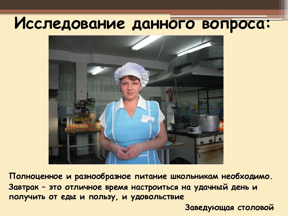 Полноценное и разнообразное питание школьникам необходимо. Завтрак – это отличное время настроиться на удачный день и получить от еды и пользу, и удовольствие Заведующая столовой