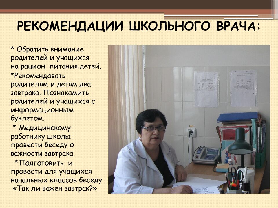 * Обратить внимание родителей и учащихся на рацион питания детей. *Рекомендовать родителям и детям два завтрака. Познакомить родителей и учащихся с информационным буклетом. * Медицинскому работнику школы провести беседу о важности завтрака. *Подготовить и провести для учащихся начальных классов беседу «Так ли важен завтрак?».