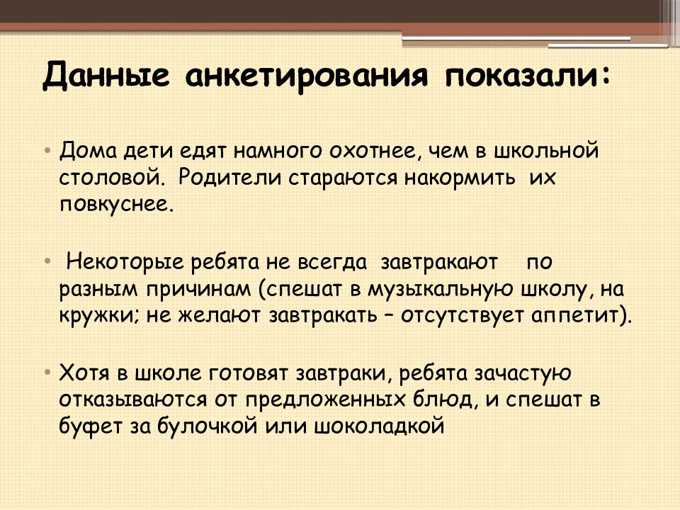 Дома дети едят намного охотнее, чем в школьной столовой. Родители стараются накормить их повкуснее. Некоторые ребята не всегда завтракают по разным причинам (спешат в музыкальную школу, на кружки; не желают завтракать – отсутствует аппетит ). Хотя в школе готовят завтраки, ребята зачастую отказываются от предложенных блюд, и спешат в буфет за булочкой или шоколадкой