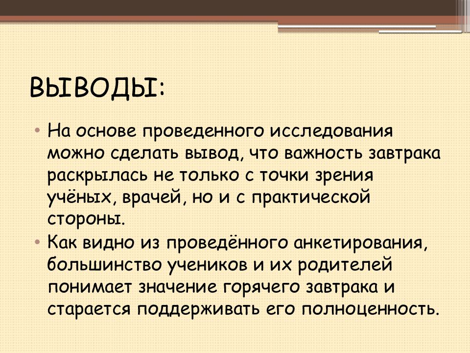 На основе проведенного исследования можно сделать вывод, что важность завтрака раскрылась не только с точки зрения учёных, врачей, но и с практической стороны. Как видно из проведённого анкетирования, большинство учеников и их родителей понимает значение горячего завтрака и старается поддерживать его полноценность.