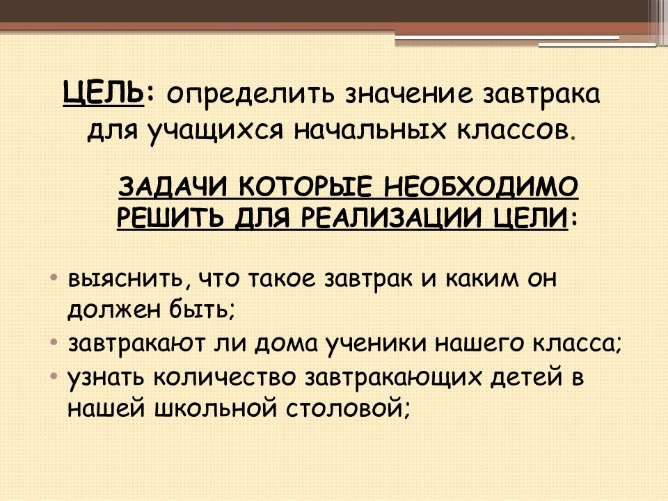 ЗАДАЧИ КОТОРЫЕ НЕОБХОДИМО РЕШИТЬ ДЛЯ РЕАЛИЗАЦИИ ЦЕЛИ : выяснить, что такое завтрак и каким он должен быть; завтракают ли дома ученики нашего класса; узнать количество завтракающих детей в нашей школьной столовой;