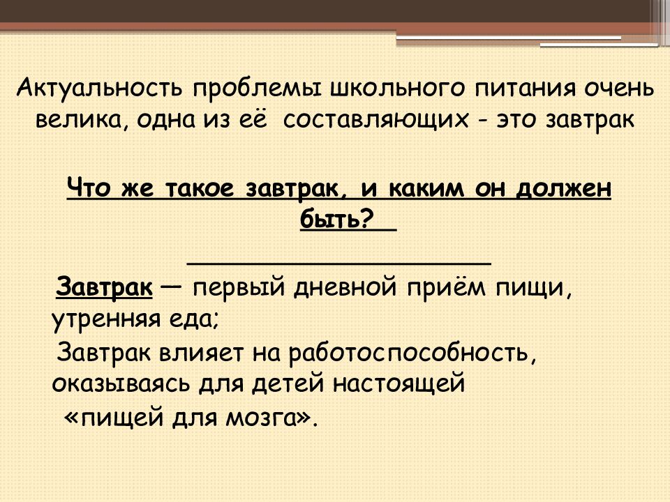 Что же такое завтрак, и каким он должен быть? Завтрак — первый дневной приём пищи, утренняя еда ; Завтрак влияет на работоспособность, оказываясь для детей настоящей «пищей для мозга».