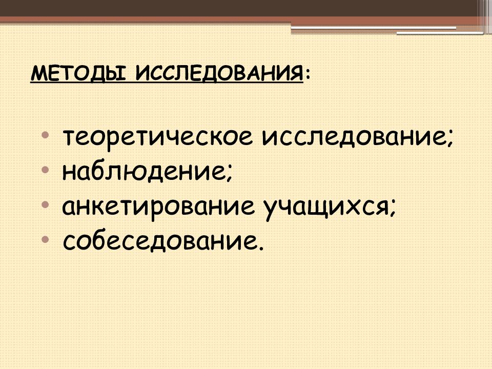 теоретическое исследование; наблюдение; анкетирование учащихся; собеседование.
