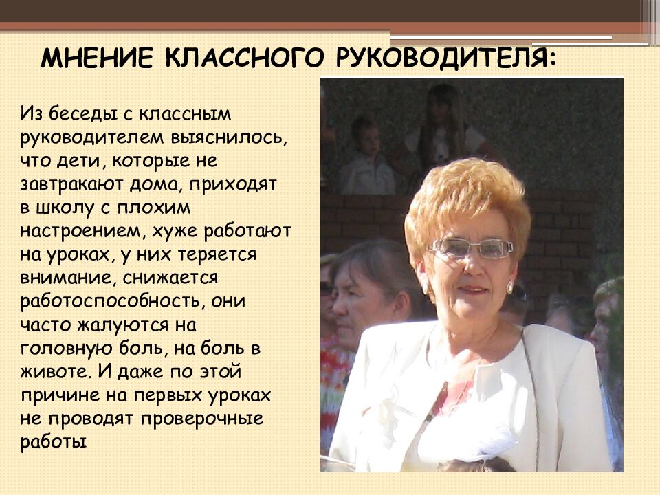 Из беседы с классным руководителем выяснилось, что дети, которые не завтракают дома, приходят в школу с плохим настроением, хуже работают на уроках, у них теряется внимание, снижается работоспособность, они часто жалуются на головную боль, на боль в животе. И даже по этой причине на первых уроках не проводят проверочные работы