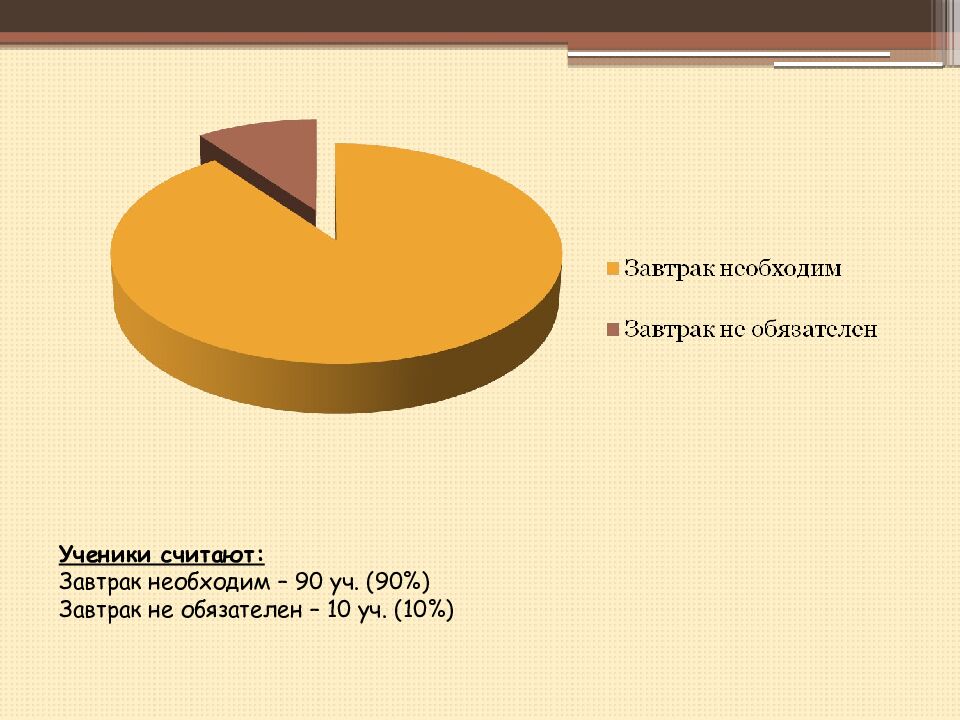 Слайд 8: Ученики считают: Завтрак необходим – 90 уч. (90%) Завтрак не обязателен – 10 уч. (10%)