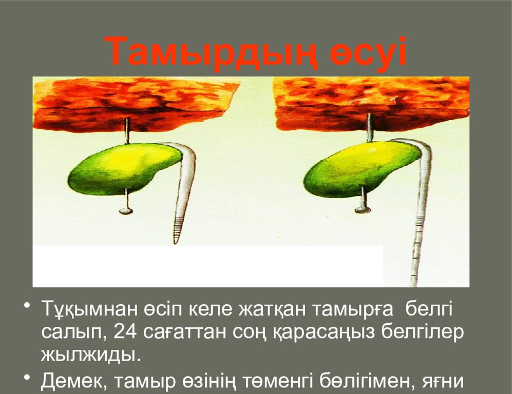 Тұқымнан өсіп келе жатқан тамырға белгі салып, 24 сағаттан соң қарасаңыз белгілер жылжиды. Демек, тамыр өзінің төменгі бөлігімен, яғни өсу аймағымен өседі.