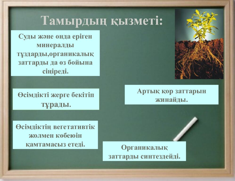 Тамырдың қызметі: Суды және онда еріген минералды тұздарды,органикалық заттарды да өз бойына сіңіреді. Артық қор заттарын жинайды. Өсімдіктің вегетативтік жолмен көбеюін қамтамасыз етеді. Өсімдікті жерге бекітіп тұрады. Органикалық заттарды синтездейді.