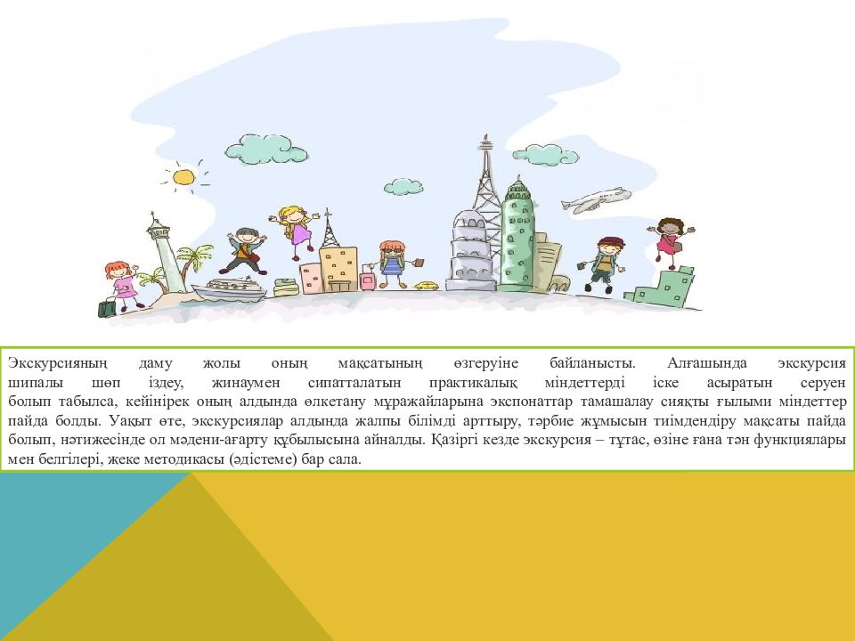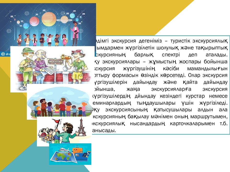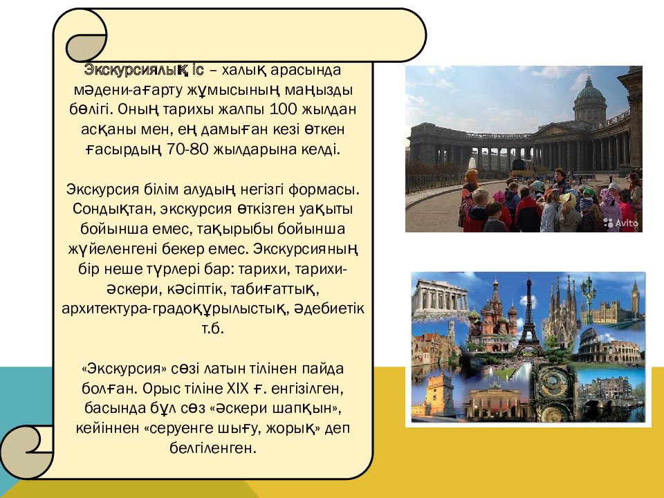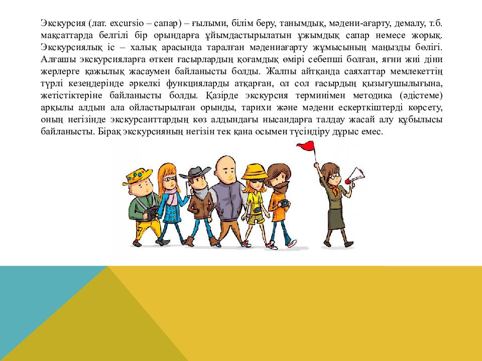 Экскурсиялық іс – халық арасында мәдени-ағарту жұмысының маңызды бөлігі. Оның тарихы жалпы 100 жылдан асқаны мен, ең дамыған кезі өткен ғасырдың 70-80 жылдарына келді. Экскурсия білім алудың негізгі формасы. Сондықтан, экскурсия өткізген уақыты бойынша емес, тақырыбы бойынша жүйеленгені бекер емес. Экскурсияның бір неше түрлері бар: тарихи, тарихи-әскери, кәсіптік, табиғаттық, архитектура- градоқұрылыстық, әдебиетік т.б. «Экскурсия» сөзі латын тілінен пайда болған. Орыс тіліне XIX ғ. енгізілген, басында бұл сөз « әскери шапқын », кейіннен « серуенге шығу, жорық » деп белгіленген.