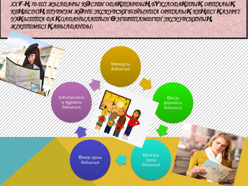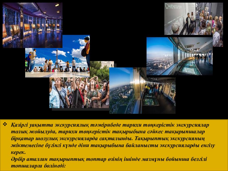 Мызмуны бойынша экскурсиялар бөлінеді : шолуық және тақырыптық. Оның ішінде тақырыптық келесі топтарға бөлінеді :