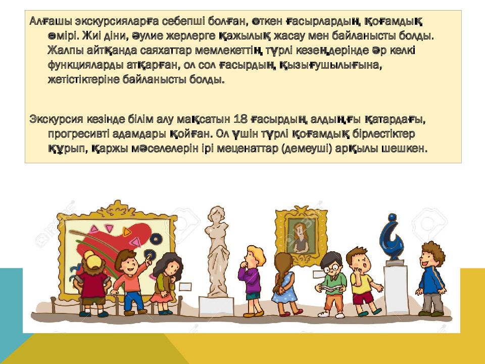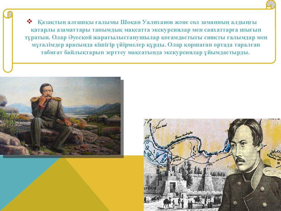 Қазақтың алғашқы ғалымы Шоқан Уалиханов және сол заманның алдыңғы қатарлы азаматтары танымдық мақсатта экскурсиялар мен саяхаттарға шығып тұратын. Олар Әуесқой жаратылыстанушылар қоғамдастығы сияқты ғалымдар мен мұғалімдер арасында кішігір үйірмелер құрды. Олар қоршаған ортада таралған табиғат байлықтарын зерттеу мақсатында экскурсиялар ұйымдастырды.
