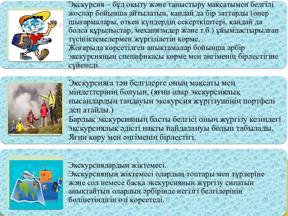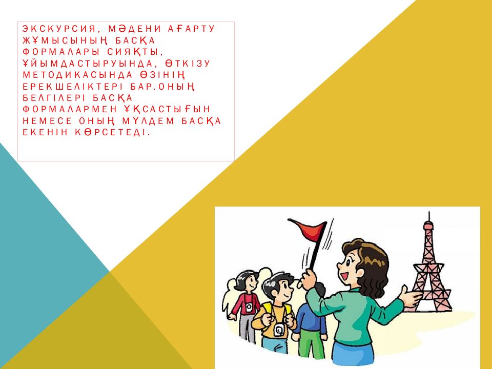 Экскурсия, мәдени ағарту жұмысының басқа формалары сияқты, ұйымдастыруында, өткізу методикасында өзінің ерекшеліктері бар.Оның белгілері басқа формалармен ұқсастығын немесе оның мүлдем басқа екенін көрсетеді.