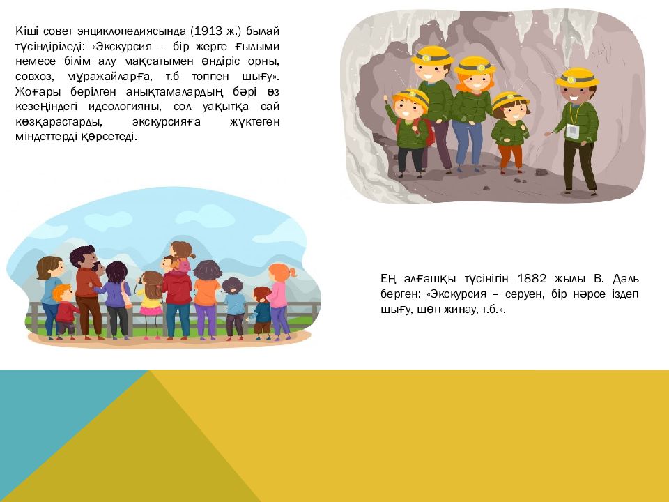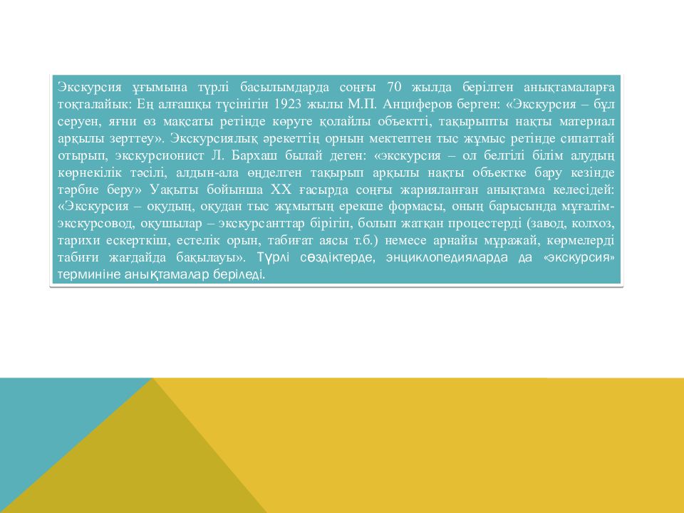 Экскурсия ұғымына түрлі басылымдарда соңғы 70 жылда берілген анықтамаларға тоқталайык : Ең алғашқы түсінігін 1923 жылы М.П. Анциферов берген : «Экскурсия – бұл серуен, яғни өз мақсаты ретінде көруге қолайлы объектті, тақырыпты нақты материал арқылы зерттеу ». Экскурсиялық әрекеттің орнын мектептен тыс жұмыс ретінде сипаттай отырып, экскурсионист Л. Бархаш былай деген : «экскурсия – ол белгілі білім алудың көрнекілік тәсілі, алдын -ала өңделген тақырып арқылы нақты объектке бару кезінде тәрбие беру» Уақыты бойынша ХХ ғасырда соңғы жарияланған анықтама келесідей : «Экскурсия – оқудың, оқудан тыс жұмытың ерекше формасы, оның барысында мұғалім -экскурсовод, оқушылар – экскурсанттар бірігіп, болып жатқан процестерді (завод, колхоз, тарихи ескерткіш, естелік орын, табиғат аясы т.б.) немесе арнайы мұражай, көрмелерді табиғи жағдайда бақылауы ». Түрлі сөздіктерде, энциклопедияларда да «экскурсия» терминіне анықтамалар беріледі.