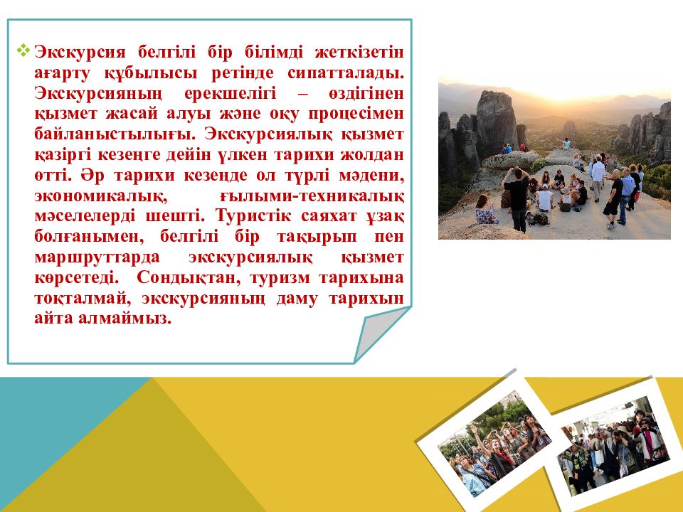 Экскурсия белгілі бір білімді жеткізетін ағарту құбылысы ретінде сипатталады. Экскурсияның ерекшелігі – өздігінен қызмет жасай алуы және оқу процесімен байланыстылығы. Экскурсиялық қызмет қазіргі кезеңге дейін үлкен тарихи жолдан өтті. Әр тарихи кезеңде ол түрлі мәдени, экономикалық, ғылыми-техникалық мәселелерді шешті. Туристік саяхат ұзақ болғанымен, белгілі бір тақырып пен маршруттарда экскурсиялық қызмет көрсетеді. Сондықтан, туризм тарихына тоқталмай, экскурсияның даму тарихын айта алмаймыз.