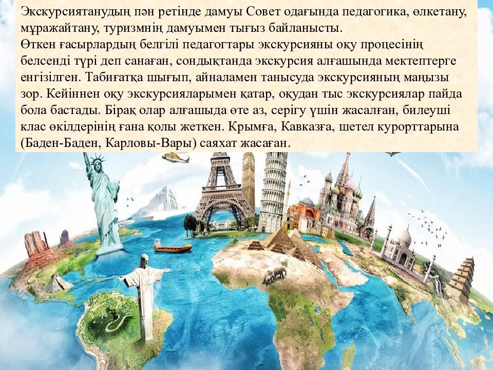 Экскурсиятанудың пән ретінде дамуы Совет одағында педагогика, өлкетану, мұражайтану, туризмнің дамуымен тығыз байланысты. Өткен ғасырлардың белгілі педагогтары экскурсияны оқу процесінің белсенді түрі деп санаған, сондықтанда экскурсия алғашында мектептерге енгізілген. Табиғатқа шығып, айналамен танысуда экскурсияның маңызы зор. Кейіннен оқу экскурсияларымен қатар, оқудан тыс экскурсиялар пайда бола бастады. Бірақ олар алғашыда өте аз, серігу үшін жасалған, билеуші клас өкілдерінің ғана қолы жеткен. Крымға, Кавказға, шетел курорттарына (Баден-Баден, Карловы-Вары) саяхат жасаған.