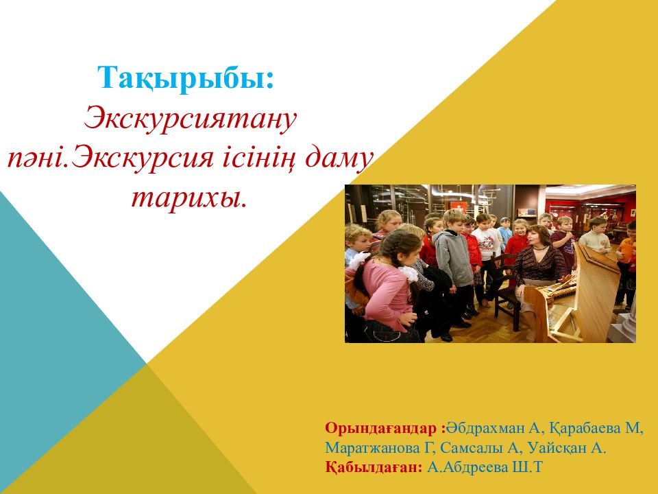 Тақырыбы : Экскурсия тану пәні. Экскурсия ісінің даму тарихы. Орындағандар : Ә бдрахман А, Қарабаева М, Маратжанова Г, Самсалы А, Уайсқан А. Қабылдаға н : А.Абдреева Ш.Т